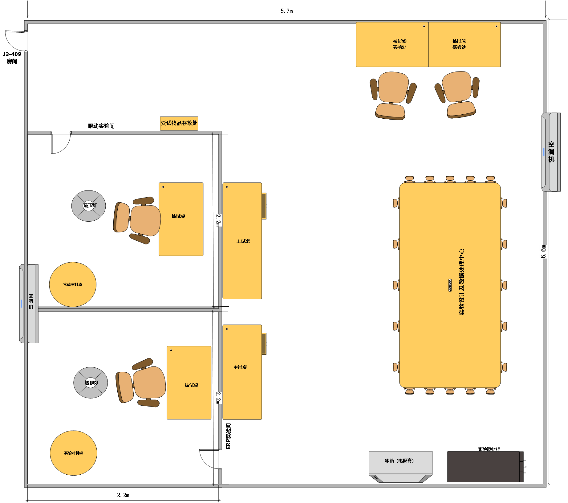 3.项目主要工程内容: 根据实验室布局规划图(见下图),将J3-409房间进行隔断并建成两个受试间,达到防噪音和防静电处理(此为ERP语言实验的必要条件)要求,并增设电源插座和两扇门。